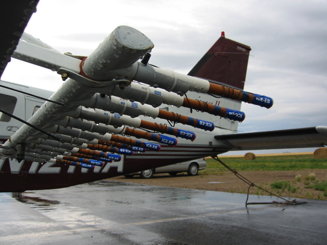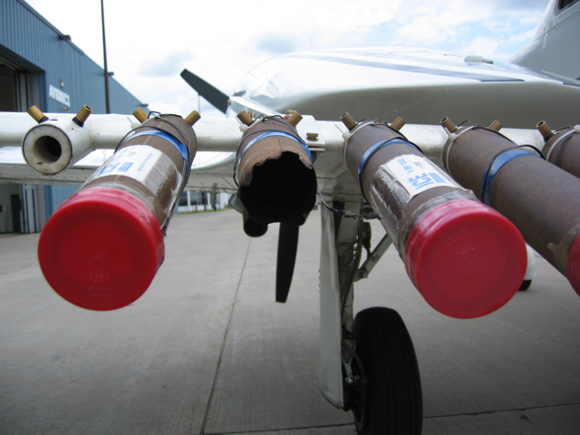 Ejectable flares are dispensed directly into growing cumulus clouds. The “candle” that is ejected contains approximately 20 grams of seeding material and burns completely in less than one minute, distributing the silver iodide nuclei inside the cloud.