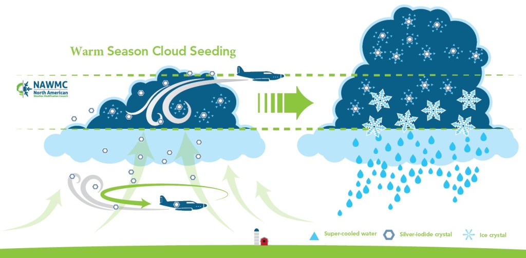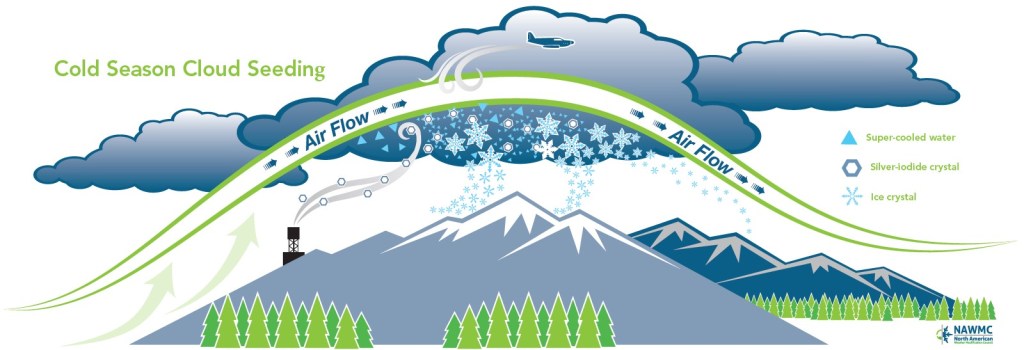 Cloud seeding improves a cloud’s ability to produce precipitation by adding tiny particles called ice nuclei (which water needs to freeze) to a cloud. These nuclei help the cloud produce precipitation by acting on supercooled liquid water (SLW), the raw material from which precipitation is formed. These artificial ice nuclei promote freezing of SLW at warmer temperatures than it would naturally, accelerating the precipitation process and making more efficient use of the water in the cloud.